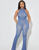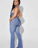 DENIM PATTERN HALTER NECK BODYCON JUMPSUIT.